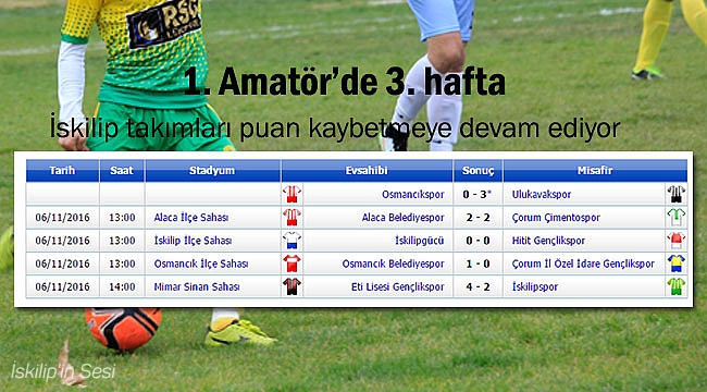 Çorum 1.Amatör kümede İskilipspor sezonun ilk yenilgisini aldı. Çorum'da 1. Amatörün gelecek vaadeden takımı Eti Lisesi Gençlikspor ile oynadığı karşılaşmadan 4-2 yenik ayrıldı.