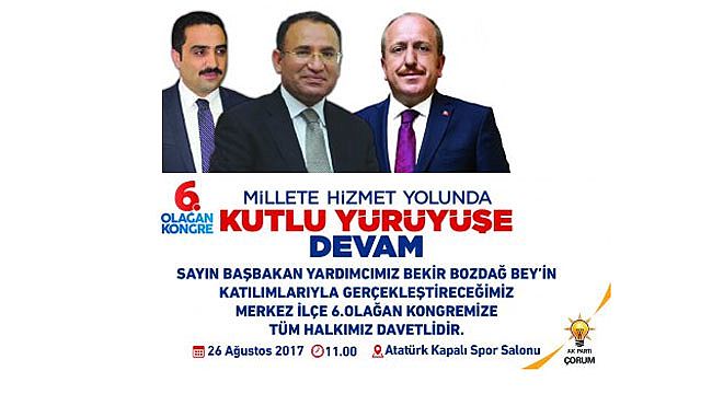 Merkez İlçe Başkanı Erhan Akar, 26 Ağustos 2017 tarihinde Atatürk Kapalı Spor Salonunda Saat 11:00'da gerçekleştirilecek olan AK Parti Çorum Merkez İlçe 6. Olağan Kongresine tüm Çorum halkını davet etti.