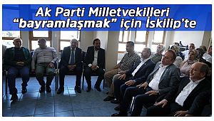Ak Parti Çorum Milletvekilleri Ahmet Sami Ceylan, Oğuzhan Kaya, Erol Kavuncu, Ak Parti İl Başkanı Mehmet Karadağ ve Çorum İl Genel Meclisi Başkanı Halil İbrahim Kaya kurban bayramının üçüncü günü olan bugün İskilip'e gelerek hem partililerle bayramlaştılar hemde 24 Temmuz seçimlerinde verilen destek için İskilip'e teşekkür ettiler. Ak Parti İskilip İlçe Başkanlığında düzenlenen bayramlaşmaya Ak Parti İlçe Başkanı Mustafa Lek, İskilip Belediye Başkanı Recep Çatma, İl Genel Meclisi Üyesi Yusuf Kaya ve partililer katıldılar.