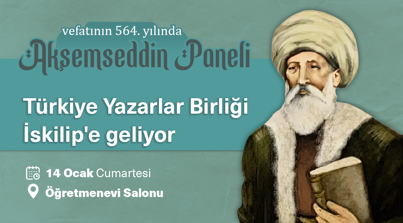 Akşemseddin Hazretleri, vefatının 564. yılında panel ile anılacak. İskilip Kaymakamlığı, İskilip Belediyesi, Türkiye Yazarlar Birliği ve Bolu ÇORDER tarafından desteklenen panel, 14 Ocak Cumartesi günü gerçekleşecek. Panel, Şeyh Yavsi camisinde Akşemseddin Hazretlerinin ve tüm şehitlerimizin ruhuna okunacak Mevlid-i Şerif ile başlayacak. Mevlid-i Şerif'in ardından Ankara Sosyal Bilimler Üniversitesi Rektörü ve Yazarlar Birliği Başkanı Prof. Dr. Musa Kazım Arıcan'ın yöneteceği panel, Öğretmenevi'nde devam edecek. Panelin bazı konuşmacı ve konu başlıkları ise şu şekilde: