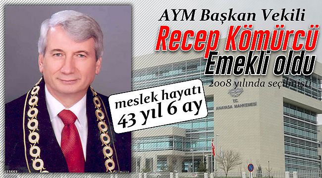 Anayasa Mahkemesi Başkanvekili hemşerimiz Recep Kömürcü bugün emekliye ayrıldı. 4 Aralık 2008 yılında Anayasa mahkemesi üyeliğine seçilen Kömürcü 8 Ekim 2019 tarihinden itibarende Anayasa Mahkemesi Başkanvekilliği görevini yürütüyordu. Hemşerimize sağlıklı ve huzurlu emeklilik günleri dileriz.