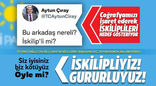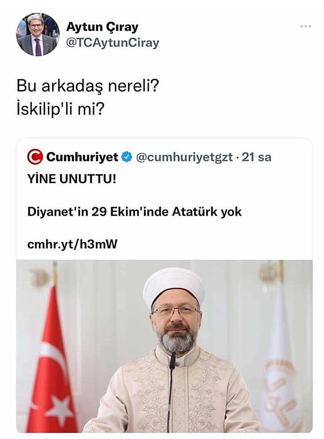 İYİ Parti İzmir Milletvekili ve Genel Başkan Danışmanı Aytun Çıray’ın, Cumhuriyet Gazetesi’nin Diyanet İşleri Başkanı Prof. Dr. Ali Erbaş’ın fotoğrafı ile paylaştığı ‘Yine unuttu! Diyanet’in 29 Ekim’inde Atatürk yok’ şeklindeki haberine yaptığı ‘Bu arkadaş nereli? İskilip’li mi?’ diyerek memleketimizi hedef alan yorumda bulundu.
