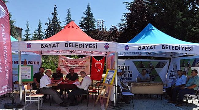 Bayat Meslek Yüksekokuluna kavuşması için Bayat Kaymakamı Oğuzhan Ocak, Bayat Belediye Başkanı Ekrem Ünlü, Milli Eğitim Müdürü Eren Davul, Lise Müdürleri ve öğretmenler elbirliği ile açılan stantlarda öğrenci ve velilere bilgi veriyorlar.