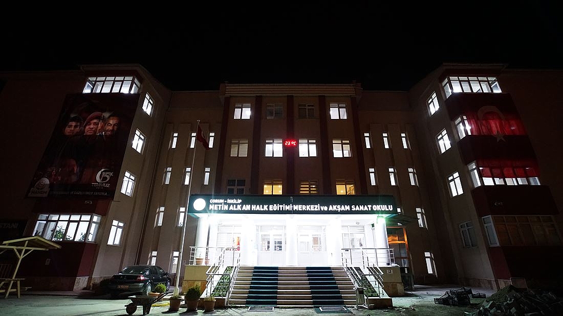 İskilip'te Hükümet binası ile İskilip Metin Alkan Halk Eğitim Merkezi (MAHEM) binaları geceye görsel efektler gibi iz bıraktı.