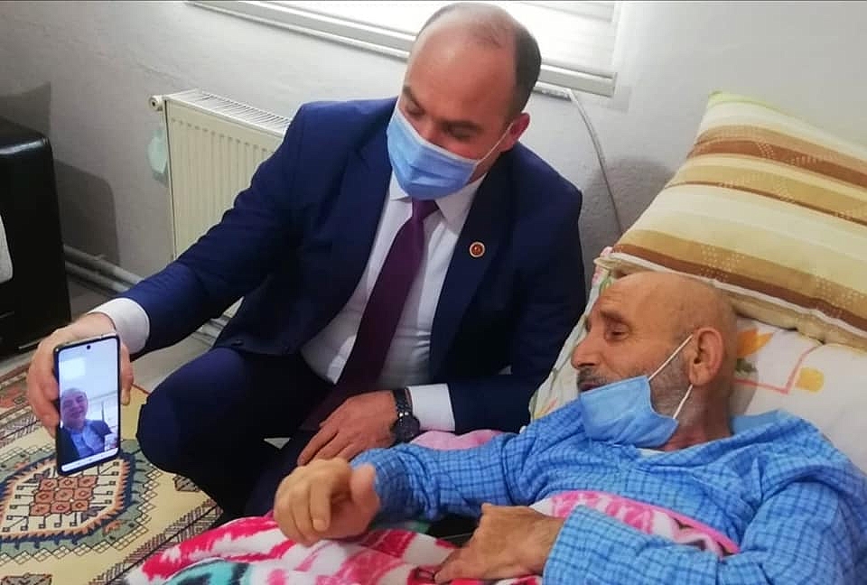 Mahalle Muhtarı Hasan Belli, tekerlekli sandalye teslimi sırasında Şükrü Özkader ile Milletvekili Ahmet Sami Ceylan’ı görüntülü olarak telefonla görüştürdü.