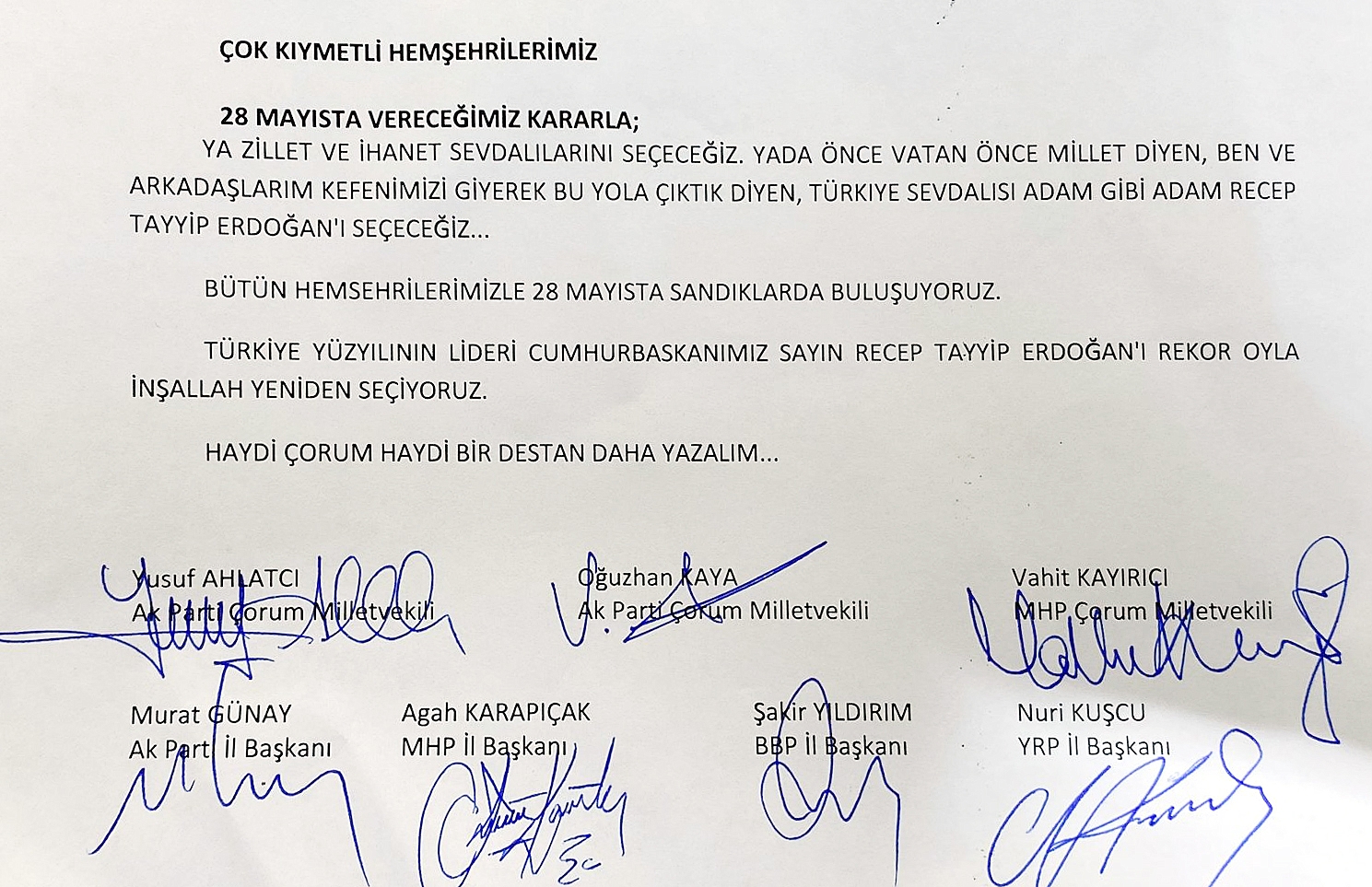 AK Parti Çorum Milletvekilleri Av. Yusuf Ahlatcı ve Av. Oğuzhan Kaya, MHP Çorum Milletvekili Vahit Kayrıcı, Belediye Başkanı Dr. Halil İbrahim Aşgın’ın AK Parti İl Başkanı Murat Günay, MHP İl Başkanı Agah Karapıçak, Büyük Birlik Partisi İl Başkanı Şakir Yıldırım, Yeniden Refah Partisi İl Başkanı Nuri Kuşçu, Ülkü Ocakları Başkanı Orhan Tosik ve AK Parti Merkez İlçe Başkanı Erhan Akar’ın katılımıyla AK Parti İl Başkanlığı’nda 28 Mayıs Cumhurbaşkanlığı seçimine ilişkin basın açıklaması yapıldı.