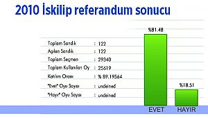2010 Türkiye anayasa değişikliği referandumu, Türkiye'de anayasada yapılan birtakım değişikliklerin 12 Eylül 2010 tarihinde halk oylamasına sunuldu. 26 maddelik bir değişikliği içeren paket, TBMM tarafından kabul edildikten sonra Cumhurbaşkanı Abdullah Gül tarafından referanduma sunuldu. Referandum sonucunda %57.88 evet ve %42.12 hayır oyu çıkarak anayasa değişiklikleri kabul edilmişti.