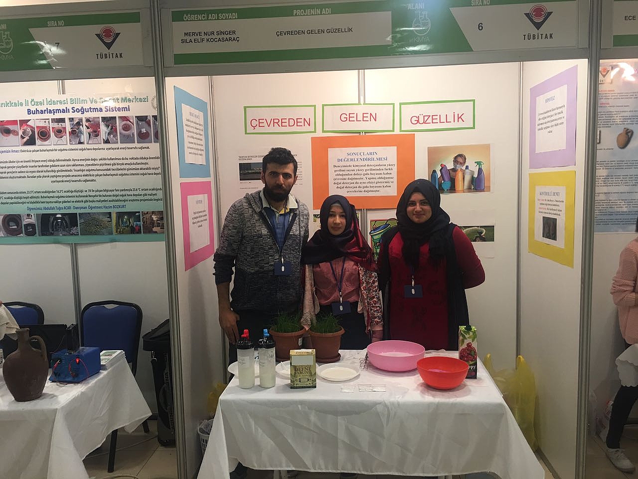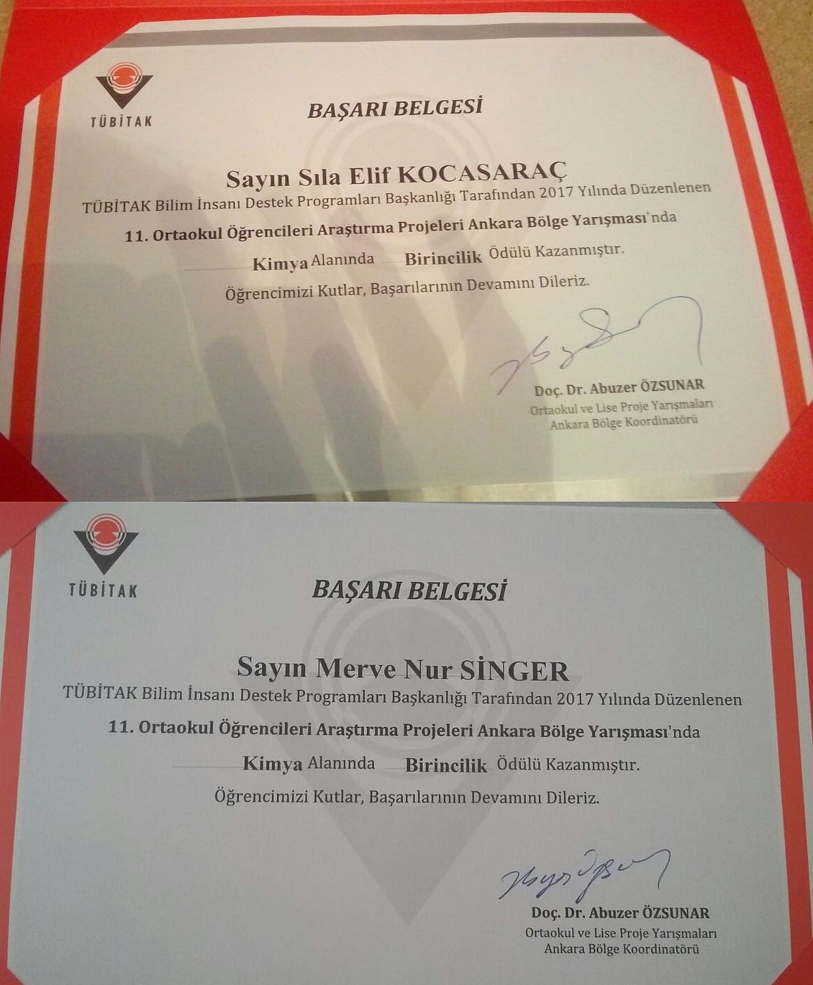 Fen Bilimleri Öğretmeni Emre ERDEN ile Rehber Öğretmen Şahin CEYLAN’ın danışmanlığında, öğrencilerimiz hazırlamış oldukları iki farklı proje ile Ankara Bölge Sergisi’nde ilçemizi temsil ettiler. Öğrencilerimiz Merve Nur SİNGER ve Sıla Elif KOCASARAÇ'ın hazırlamış oldukları “Çevreden Gelen Güzellik” projesi Kimya alanında birincilik ödülü kazanarak Ankara Bölgesi’ni Türkiye Finallerinde temsil etmeye hak kazandı.