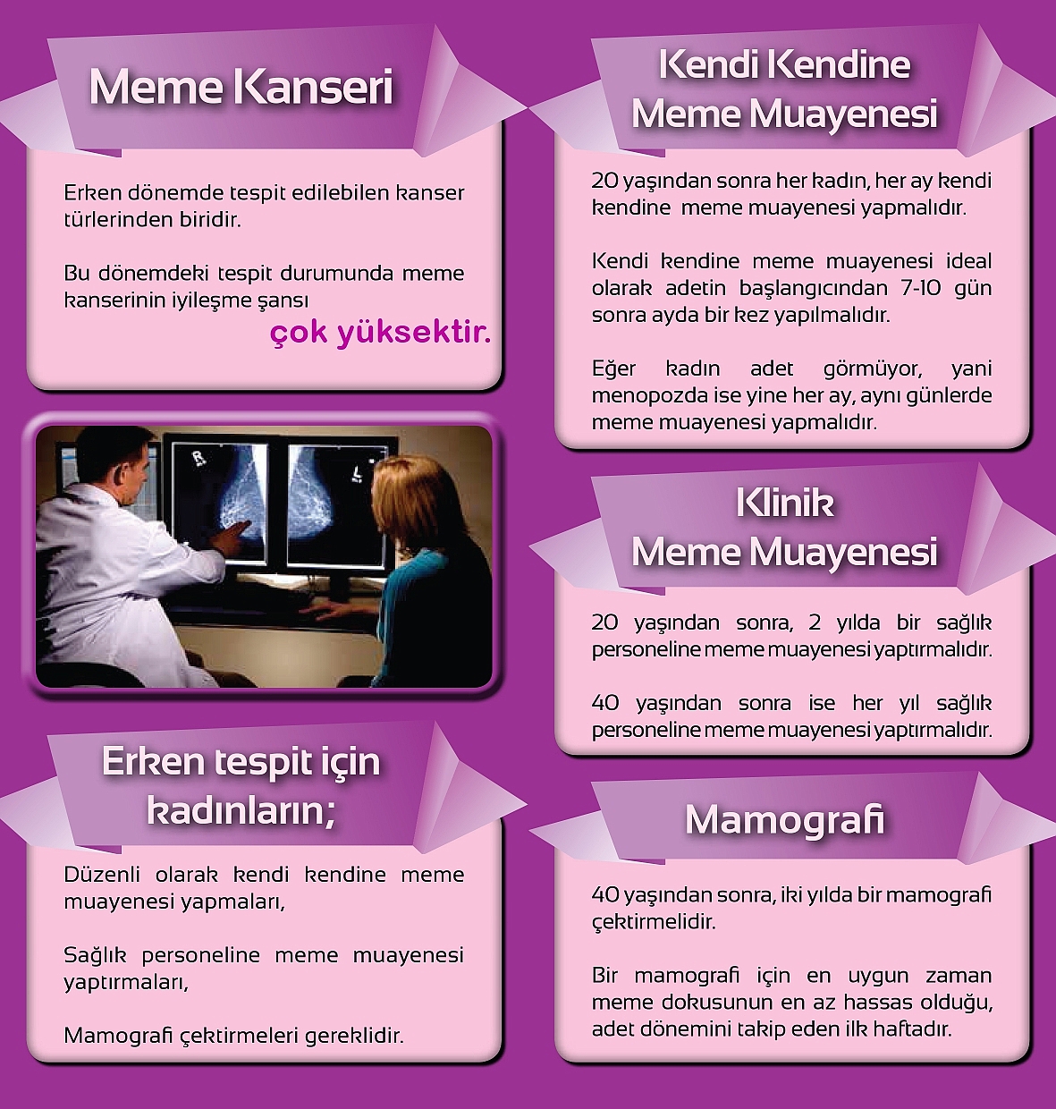 *Erken tespit için kadınların; düzenli olarak meme muayenesi yapmaları, sağlık personeline meme muayenesi yaptırmaları, Mamografi çektirmeleri gerekir.