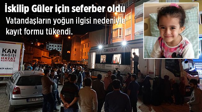 İskilip'in Akpınar köyünde oturan Coşkun Gökmen'in kızı Güler için başlatılan donör tarama kampanyasına çok sayıda İskilipli katıldı. Saat 16.00'dabaşlayan kan alma işleminde şua na kadar 500'e yakın vatandaş emek taksi alanı olarak bilinen alana kurulan Türk Kızılay'ına kan toplama ekibine kan verdi. Vatandaşların büyük çoğunluğu hem donör tarama testi için hemde kan bağışında bulunmak için ünite kan verdiler.