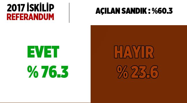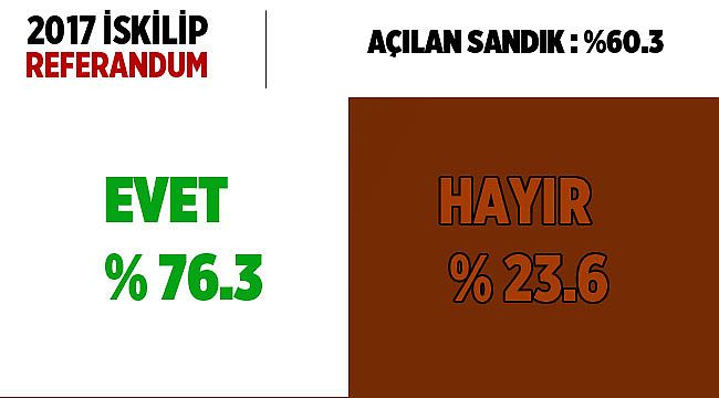 İskilip'te referandum sonuçları önceki seçimlerde de olduğu gibi bu defada Cumhurbaşkanlığı sistemi oylamasında açık ara Recep Tayyip Erdoğan'ın ortaya koyduğu fikirleri destekliyor.