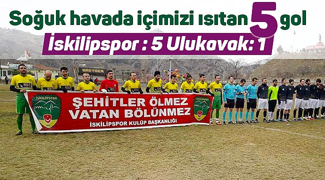 Çorum 1.Amatör liginde bugün İskilip'te oynanan İskilipspor - Ulukavakspor karşılaşması takımımızın 5-1'lik galibiyeti ile tamamlandı. İskilipspor'un 3 golünü Ulukavak'tan transfer edilen Sefa kaydederken, Emre ve Murat'ta birer gol kaydettiler. İskilipspor karşılaşmanın başından itibaren oyun üstünlüğünü korudu. Havanın soğuk olmasına rağmen az sayıda taraftar trübün desteğine devam etti. İskilipspor haftaya erteleme maçı olan Alaca BLD Spor ile karşılaşacak.