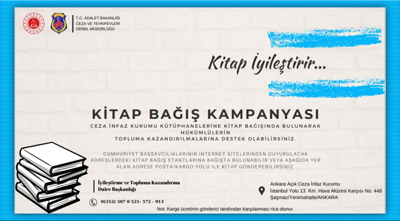 Adalet Bakanlığı, “Kitap İyileştirir” sloganıyla Ceza İnfaz Kurumu Kütüphaneleri için kitap bağış kampanyası başlattı. Kampanya ülke genelinde olduğu gibi İskilip'te de hayata geçirilecek.