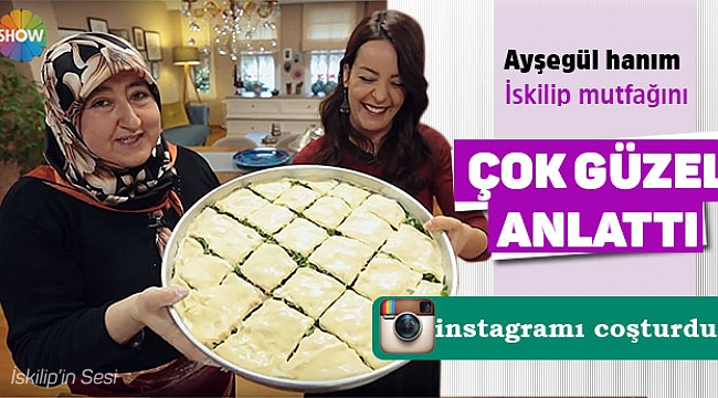 Televizyonların iddialı yemek programı "Nursel'in mutfağı'nda" bugün İskilipyemekleri vardı. Programın konuğu olan hemşerimiz Ayşegül Sert, İskilip Dolması, Sirke Salatası, Karabörek, Yırtma ve Gül Kadayıfı yaptı ve anlattı. İskilipkadınlarının doğal davranışları içerisinde anlattığı İskilip yemekleri instagramı (nurselinmutfagi) coşturdu.
