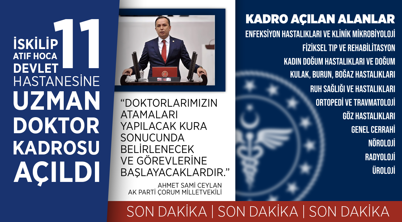 AK Parti MKYK Üyesi ve AK Parti Çorum Milletvekili Ahmet Sami Ceylan, Sağlık bakanlığı tarafından İskilip’te görevlendirmek üzere çeşitli branşlarda 11 uzman doktor kadrosunun tahsis edildiğinin müjdesini verdi.
