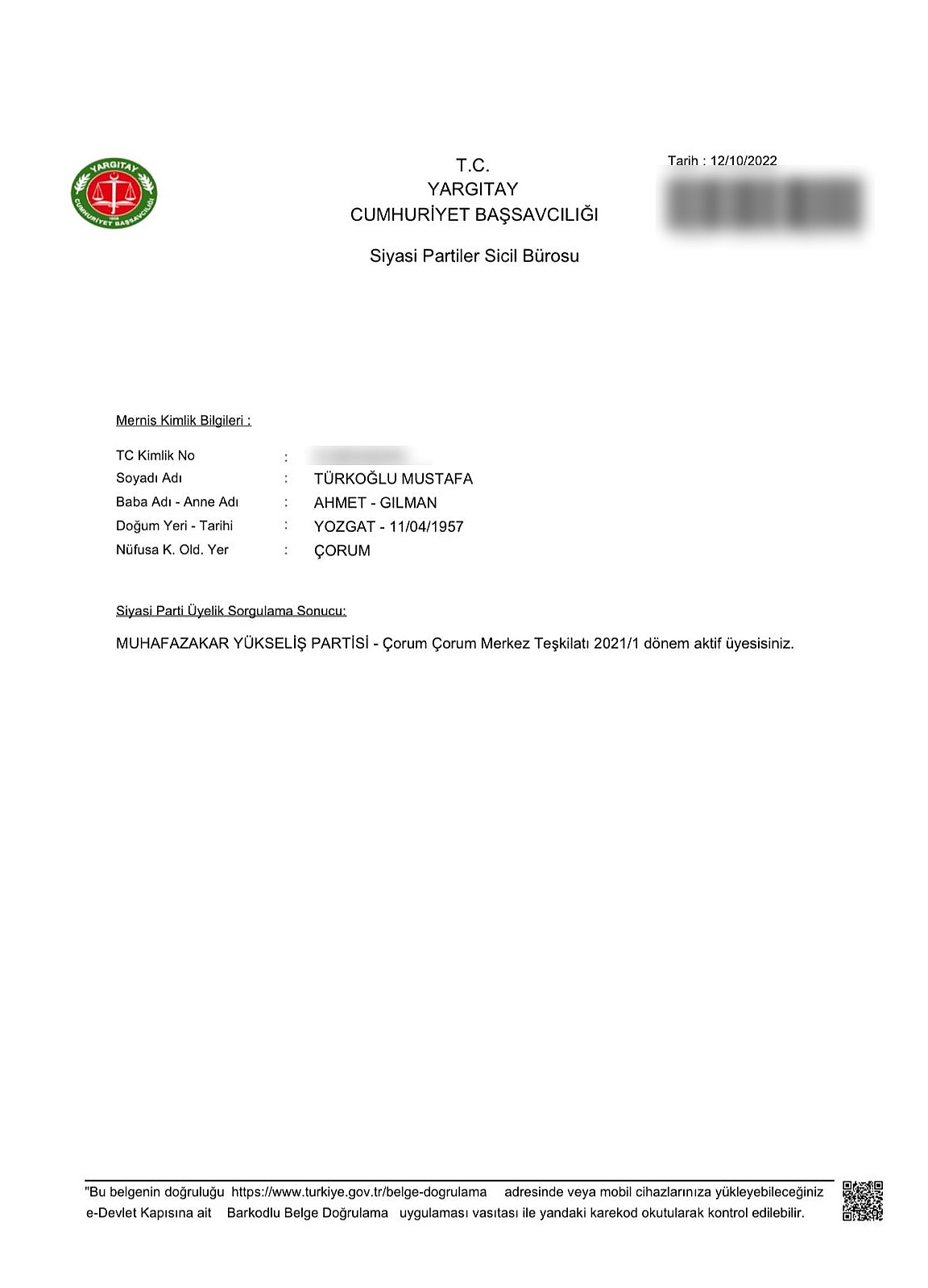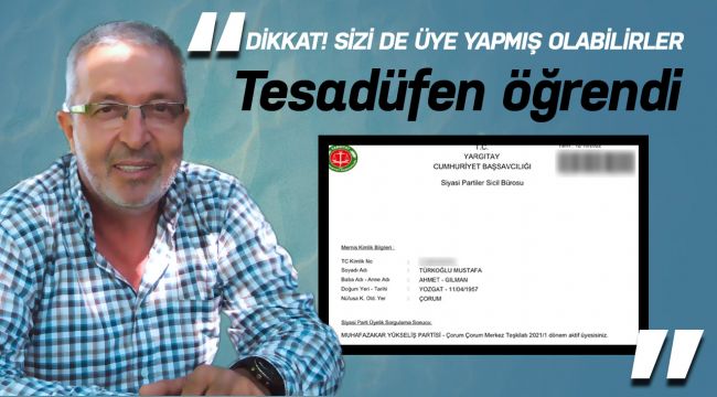 İstanbul'da oturan hemşerimiz Mustafa Nedim Türkoğlu genel başkanlığını Ahmet Reyis Yılmaz'ın yaptığı Muhafazakar Yükseliş Partisi'nin aktif üyesi olduğunu öğrendi. Türkoğlu " Adını bile ilk kez duyduğum partinin üyesi olduğumu tesadüfen e-devlet sorgulaması ile öğrendim. Bilgim dışında böyle bir üyelik nasıl olmuş anlayamadım. Vatandaşlarımızın uyanık olması lazım. Benim gibi sizlerde bilginiz dışında bir siyasi partinin aktif üyesi çıkabilirsiniz" diye konuştu.