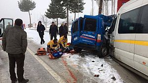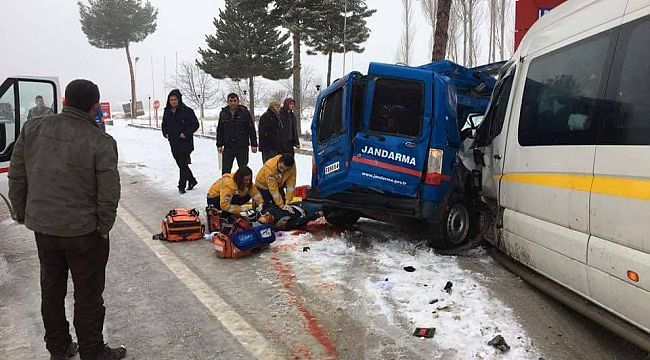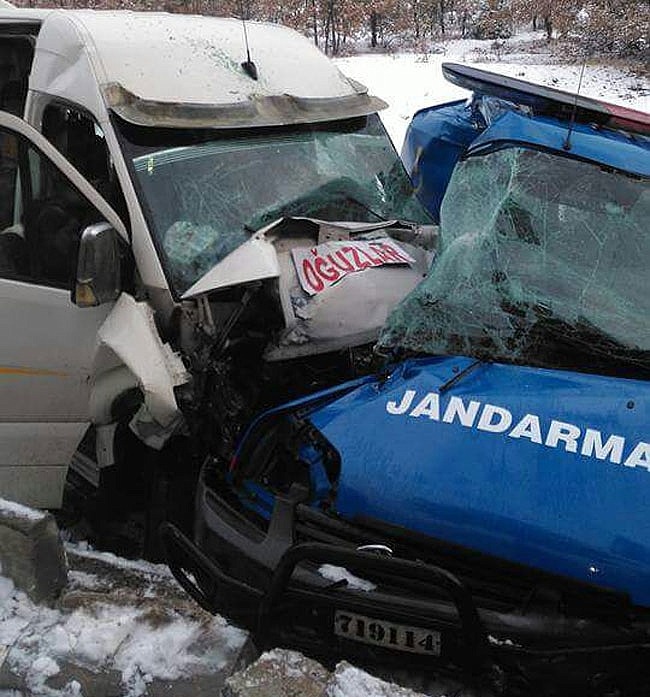 Edinilen bilgiye göre, Laçin İlçesi’nde bulunan bir akaryakıt istasyonu önünde Jandarma’ya ait askeri araç ile 19 m 4030 plakalı bir minibüs, buz tutan yolda kafa kafaya çarpıştı.