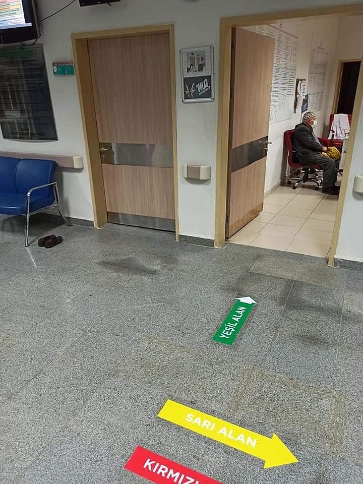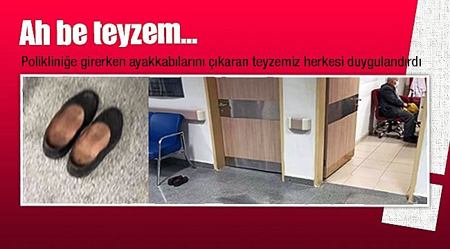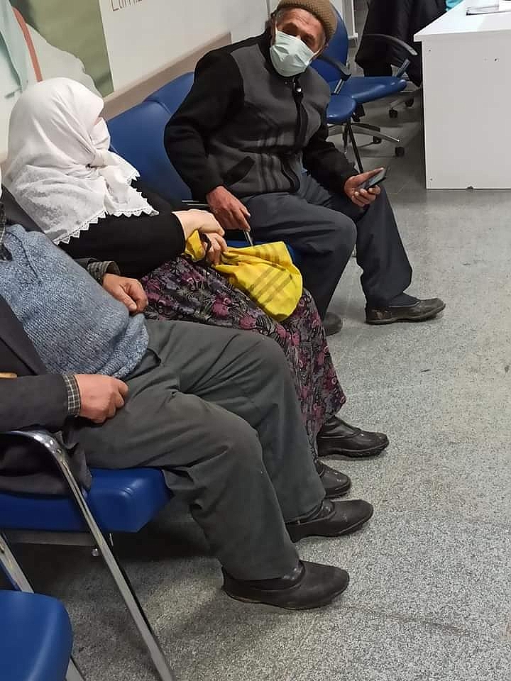 Fotoğrafta gözüken teyze'miz muayene sırası gelince "Ayakkabılarım çamurlu"deyip, lastik ayakkabılarını çıkarıp mesleriyle muayeneye gitti (personelin olsun teyze.bişey yok.bizler temizleriz,demesine rağmen).