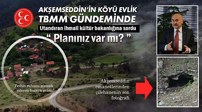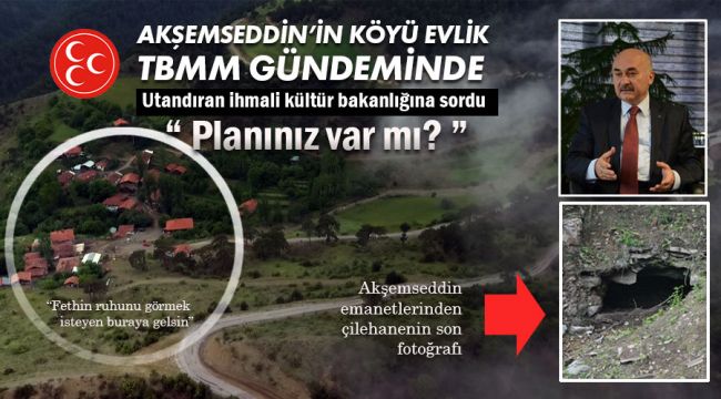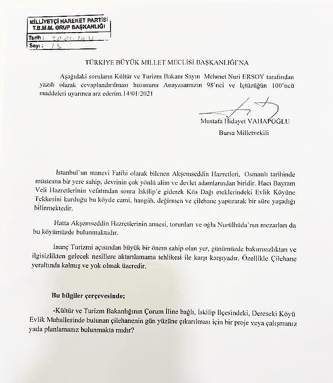 Milliyetçi Hareket Partisi Genel Başkan Yardımcısı, Bursa Milletvekili, TBMM Milli Savunma Komisyonu ile Güvenlik ve İstihbarat Komisyonları Üyesihemşehrimiz M. Hidayet Vahapoğlu Akşemseddin Hazretlerinin Evlik Köyünde bulunan çilehanesinin gün yüzüne çıkarılması için Kültür ve Turizm Bakanlığına önerge verdi.