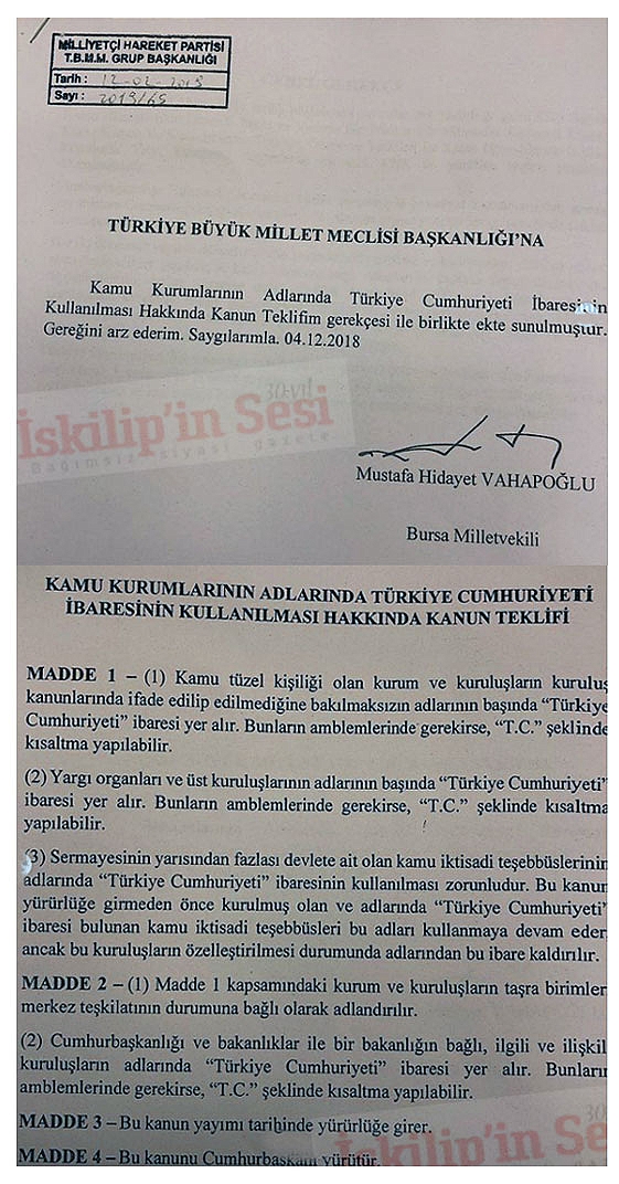 MHP Genel Başkan Yardımcısı ve Bursa Milletvekili hemşerimiz Mustafa Hidayet Vahapoğlu TBMM Başkanlığna verdiği Türkiye Cumhuriyeti ibaresinin kamu kurumlarında yeniden kullanılmasına ilişkin kanun teklifi verdi. Vahapoğlu yaptığı açıklamada "“Kamu Kurumlarının adlarında Türkiye Cumhuriyeti ibaresinin kullanılması hakkında Kanun Teklifimizi verdik.. Hayırlı olsun.." dedi